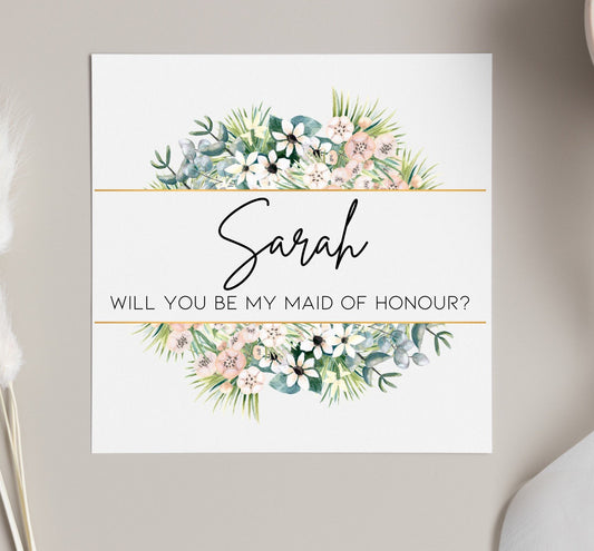 Will you be my bridesmaid card, botanical floral maid of honour proposal card and envelope, personalised bridesmaid card