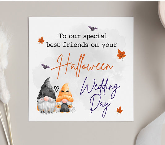 To our Son and daughter in law on your Halloween wedding day, best friends wedding card with Halloween gonks, Halloween 2023 cards