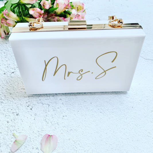 Bride handbag, white bridal clutch bag, personalised clutch bag, newlywed handbag, new Mrs handbag, honeymoon accessories, gift for bride