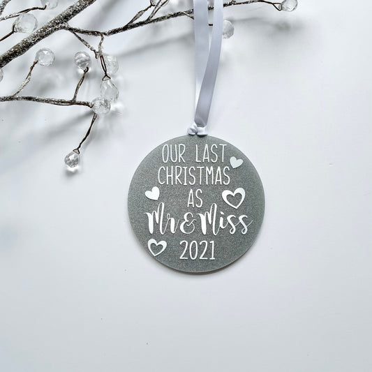 Last Christmas as Mr and Miss Xmas tree decoration, 2023 wedding gift, bauble for engaged couple, bride and groom Xmas gift
